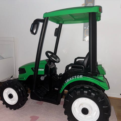 Siku radiostyrd traktor John deere 8345r och en Joskin vagn. Vagnen har ett stödben som kan vevas ned samt elektrisk tipp som styrs från fjärrkontrollen efter att vagnen anslutits till traktorn. Både traktor och vagn har fungerande lampor.