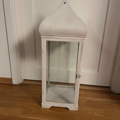 Stormlykta Cecilia från Sagaform i klart glas med graverad dekor i form av lagerkransar. Höjd 30 cm. Diameter 22 cm. En present som inte kommit till användning.