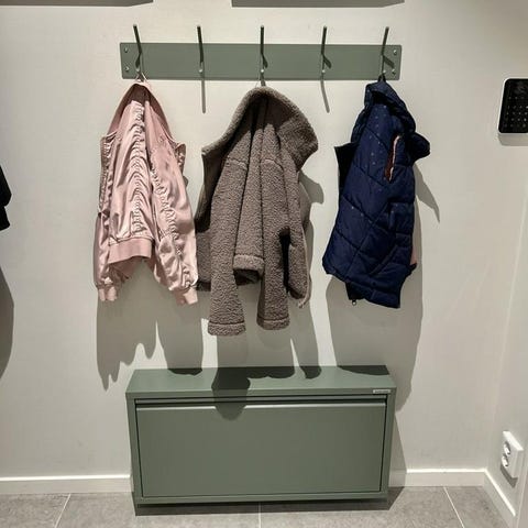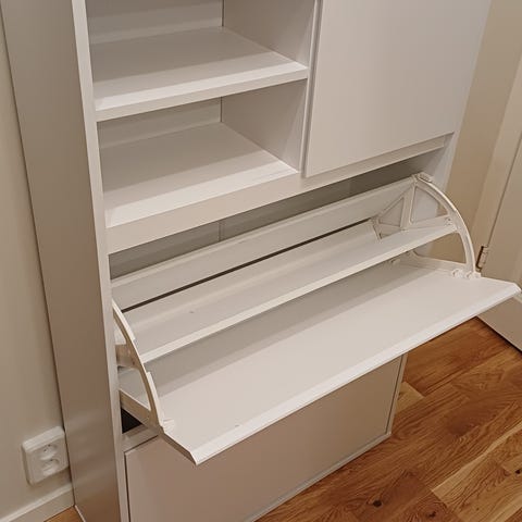 Skohyllan har fyra fack för skor och rymmer en hel del, en låda upptill för diverse småsaker. Fästs i väggen.