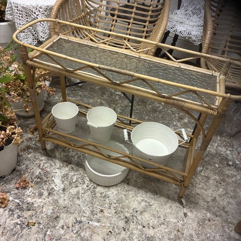 BLOMBORD, string-modell, 1950-60-tal. Stomme i vit trådmetall och teakfaner. Bruksslitage.