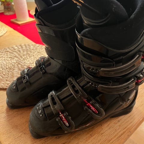 Head ST skidpjäxor i storlek 280. Skidpjäxorna är svarta med orangea detaljer och har flera spännen för justering. De är avsedda för skidåkning och är konstruerade för att ge stöd och komfort under användning.
