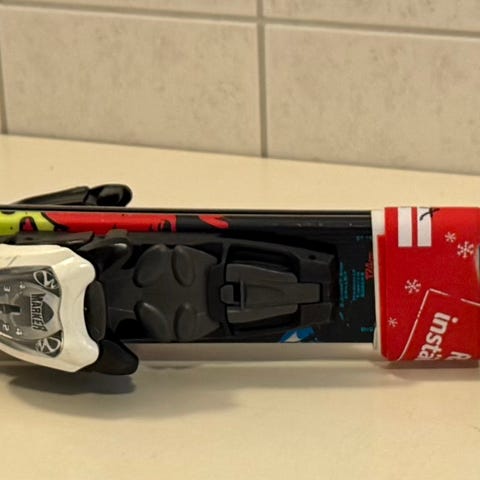 K2. Längd 139 cm utrustade med bindningar. Levereras med Accezzi skidsäck.