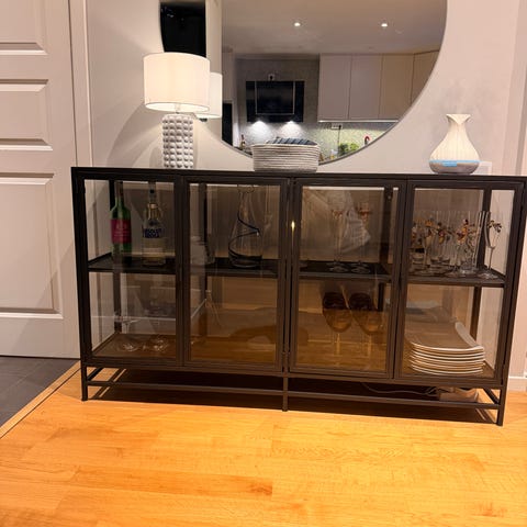 Skänk i svart högglans. 3 dörrar. Två av skåpen har 2 hyllplan vardera. Ett skåp med glasdörr och ställning för att lägga flaskor.