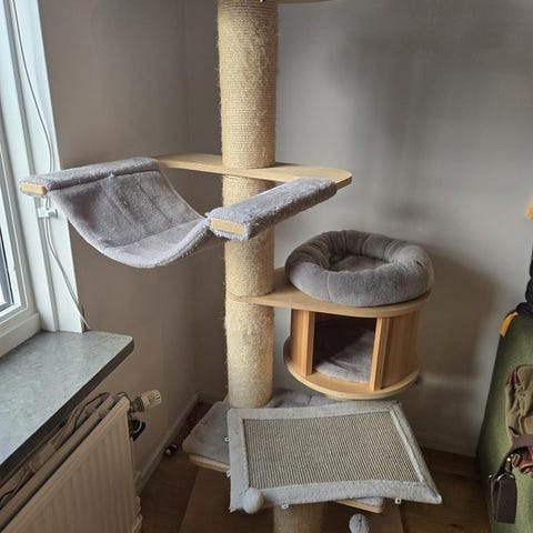 Handgjord klösbräda för katt. Helt i naturliga material, trä och jute. Aldrig använd. 103 cm hög, 38 cm bred.