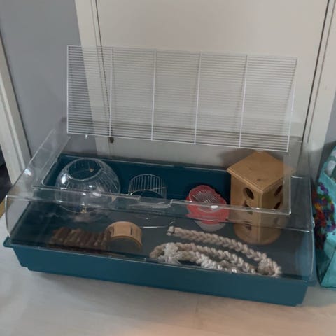 Ingår tillbehör?: Vattenbehållaren som syns på bilden ingår, resten flyttades i andra buren