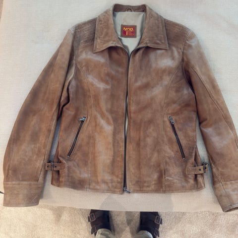 Tobaksbrun MC jacka av märket BIKER fint skick dock fattas en knapp som inte syns finns extra man kan sy på. Mäktig känsla att ha på sig, fodrad.