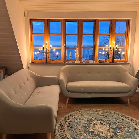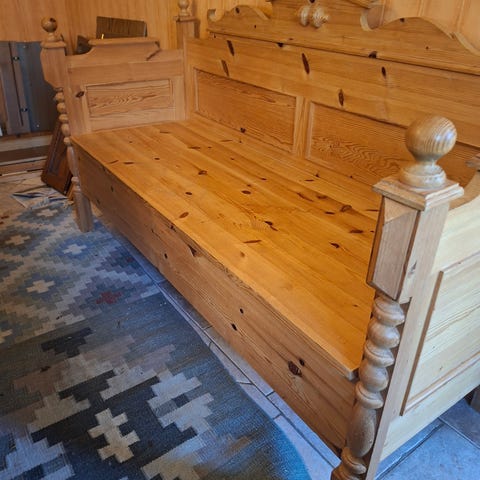 180 cm lång, 113 cm hög i rygg, 64 cm djup. Förvaring under lock. Gammal soffa, fint skick! 950 kr