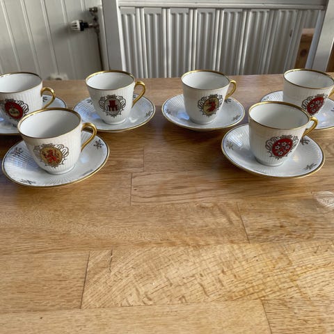 Rörstrand Diamant Viva kaffeservis – 6 koppar med fat klassiskt utförande: vit med brun rand och två små blå blommor.