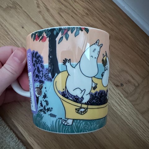 Arabia Muminmugg kopp med motiv från Muminserien. Tillverkad i keramik, lämplig för maskindisk och mikrovågsugn. Färgglad design med Muminfigurer runt koppen.