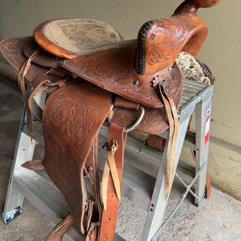 Western sadel i brunt läder med detaljerad prägling. Sadelns design inkluderar breda remmar och en robust konstruktion lämpad för ridning.