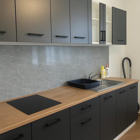 Mycket fint men i använt skick. Vitvaror, bänkskiva och belysning ingår inte.