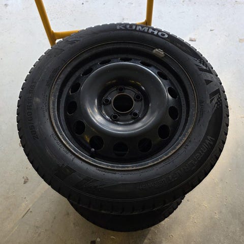 Bridgestone däck med fälgar i storlek 205/70R15 96T. Däcktyp är vinterdäck, märkta med snöflinga för vinterbruk. Fälgarna är av metall och passar för personbil. Gott ca 200 mil. Fäljarna slitna, däcken bra.