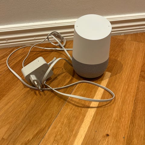 Apple HomePod 1 smart högtalare i vit färg. Designad för att leverera högkvalitativt ljud och integreras med Apple-ekosystemet. Passar för användning i hemmet för att spela musik, styra smarta hem-enheter och använda röstassistans. Fast kabel.
