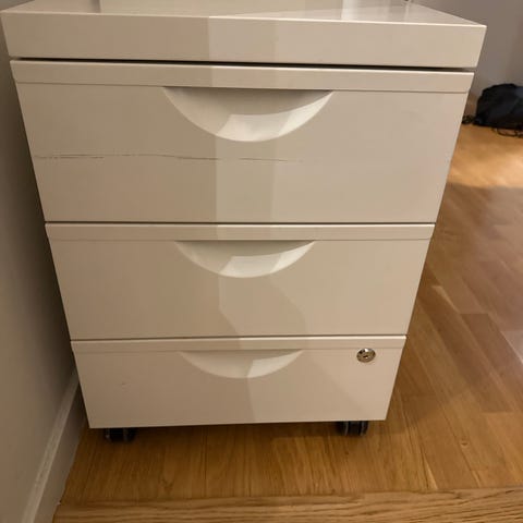 IKEA MICKE vit hurts med hjul. Mått: 50 cm bredd, 35 cm djup, 75 cm höjd.