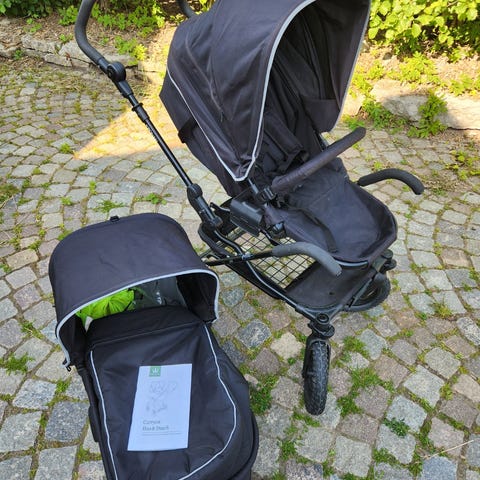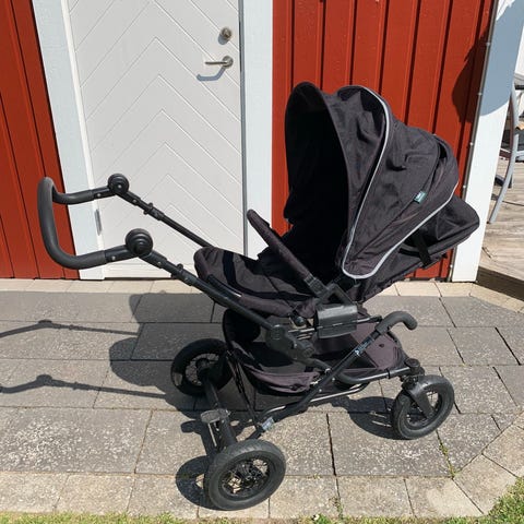 Vore jag mäklare skulle jag skriva ”Vagn med personlighet” för att låta säljande. Klart begagnat skick. Har suttit ett skumgummihandtag men som var slitet och nu är borttaget. Framför allt är den bångstyrig då däcken ibland tappar luft och drar åt håll den själv vill, inte dit jag vill, alltid överraskande och låter barnet höra invektiv det inte borde lära sig så tidigt. Bakhjulen bytta 2024. Framhjulen fick nya slangar 2024. Nästa användare behöver hålla den välpumpad. Irriterande, därav priset.