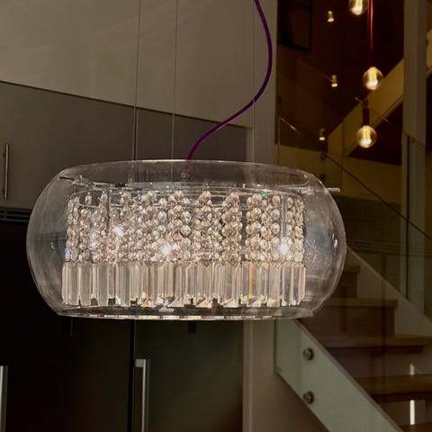 Kristallkrona med glasprismor och mässing. Har flera ljuskällor och hängs i tak med kedja. Passar för belysning i matsal eller vardagsrum. Felfritt skick.