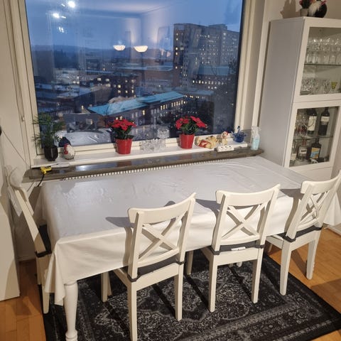 Omkrets 110 cm. Med iläggsskiva 155 långt ovalt, bordsskivan har lite skav, men jag har alltid haft duk på eftersom man ser skarvarna. Stabilt och stadigt bord