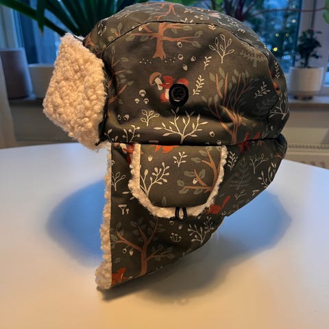 Mössan har öronlappar och justerbar rem under hakan (fästs med kardborre) för extra skydd mot kyla.