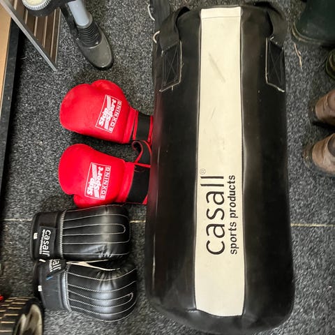 Casall boxningssäck i svart färg, designad för boxningsträning. Medföljande svarta boxningshandskar.