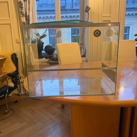 Terrarium höjd 32cm, bredd 60cm och djup 45cm. Värmelampa, värmeplatta samt belysning ingår.