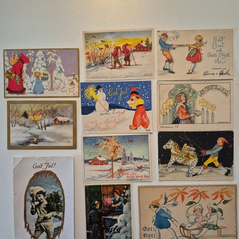 Använda vykort med julmotiv fr början av 1900-talet. 3 av Jenny Nyström. 25 kr/styck, eller alla 8 för 150 kr.