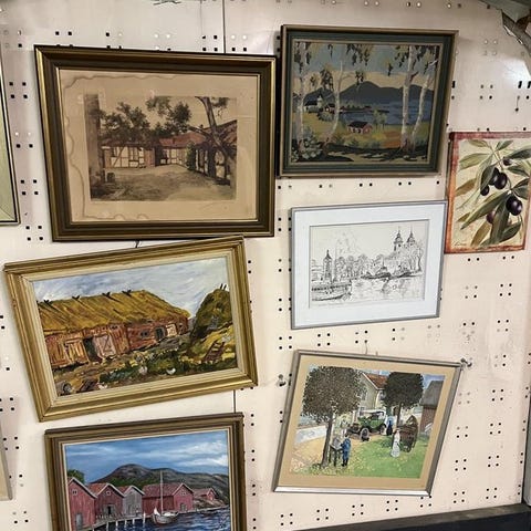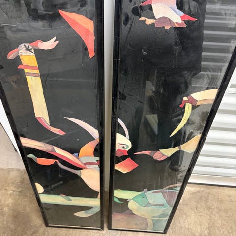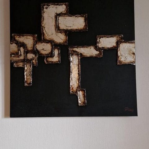 Svartvitt konsttryck set med tre tavlor