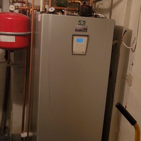 Innedelen står i en källare. Köparen bär själv upp värmepumpen.