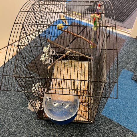 Fågelbur i metall med plastdetaljer i färgerna gul och brun. Burens konstruktion består av metallstänger och har en rund form med en ögla för upphängning. Utrustad med foder- och vattenbehållare av plast. Passar för små fåglar.