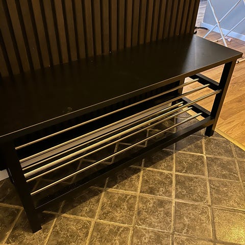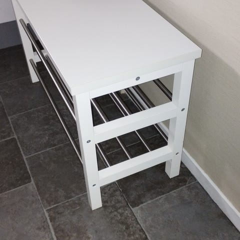 Säljer fin och praktisk bänk med skoförvaring. Stabil och robust. Fint skick. Dock är det avskavd färg vid nedre hyllan, av förklarliga skäl, där har skor stått. Samt kantstött i hörnen men inget som syns på håll.