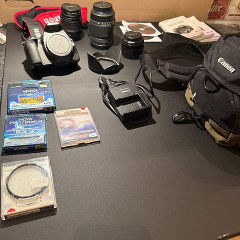 Säljer ett komplett systemkamera-paket. Paketet innehåller en Canon EOS 500D systemkamera med 4 objektiv, extern blixt, kablar, minneskort 8GB, instruktionsbok och kameraväska med regnskydd som får plats med hela kitet.