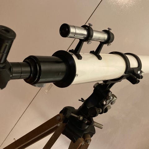 Sky-Watcher 90mm refraktorteleskop med justerbart stativ och motvikter för stabil observation. Teleskopet är svart med metallstativ och utrustat