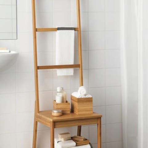 Prydnadsstege i mörkbetsad bambu köpt i DIS inredningsbutik i Stockholm. Användbar för tex avhängning av kläder.