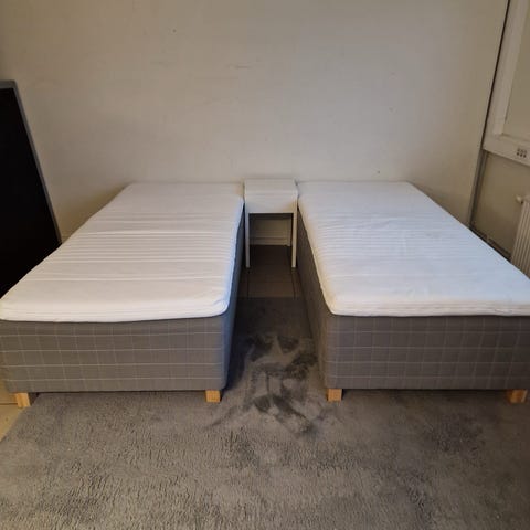 SKOTTERUD Resårbotten, medium fast/mörkgrå, 90x200 cm. Jag säljer två sängar med sänggavel. Sängar använd som ny.