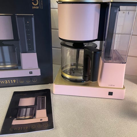 Kaffebryggare från märket ”Coline” med rosa färg och glasbehållare. Utrustad med ett handtag i svart och en transparent vattentank. Kaffebryggaren har en övre öppning för filter och bryggning.