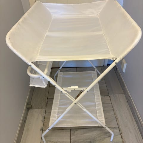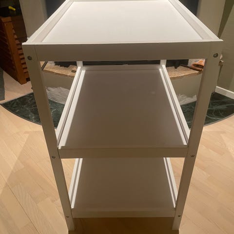 Stabilt skötbord i trä med två hyllor för smidig förvaring till salu. Skön mer naturlig finish som nötts lite på några ställen. Jag hade tankar att måla tidigare men fungerat som det är.