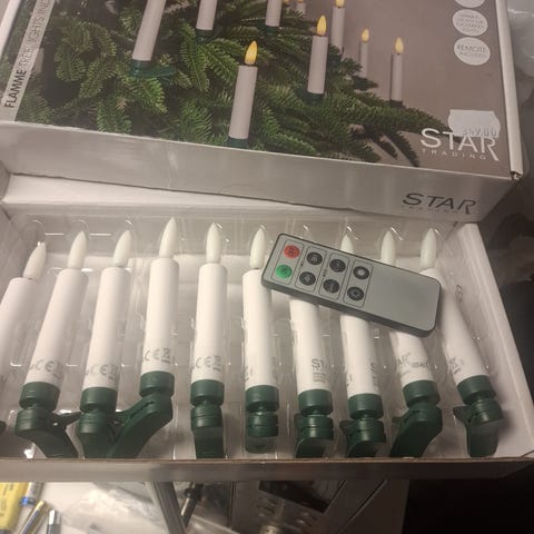 Julgransbelysning från Star Trading AB (svenskt företag). Fina ljus som ska se levande ut med stearin som rinner ner, och frostat glas.