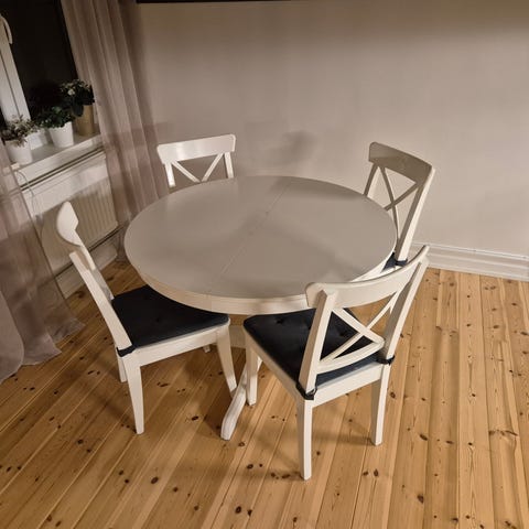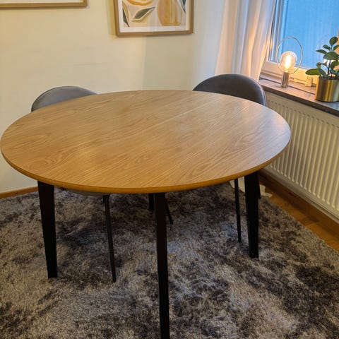 Runt bord tillverkat i trä med en rund bordsskiva och fyra ben. Passar för olika miljöer där ett runt bord behövs.