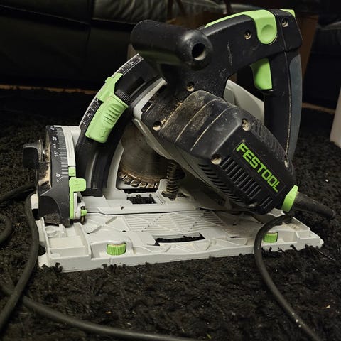 Mycket bra sänksåg som sågar hela 75 mm i djup. Används tillsammans med 1400 mm såglinjal som ingår men går även att använda utan linjal.