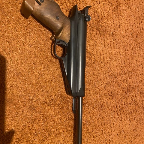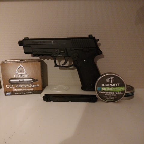 Daisy luftpistol 4.5 mm i bra skick med 11 kolsyrepatroner o kulor. Licensfri men 18 års gräns.