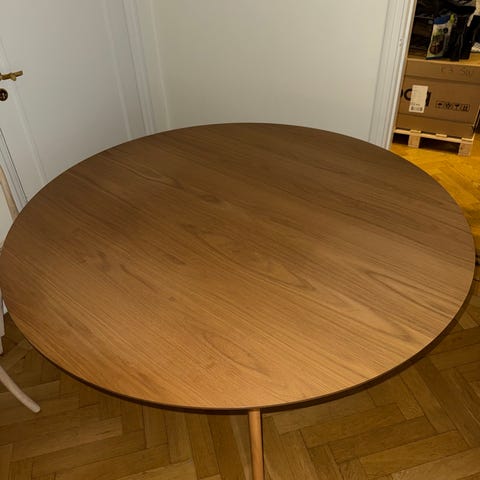 Fint ovalformat matbord med 4 st stolar. Bordet är totalt 140cm och har 3 st extra bords skivor a 45cm långa. Finns i Åkersberga