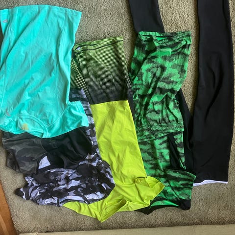Tre tröjor/hoodies stl 158/164. En fleece. En skjorta (använd bara en gång). Tre T-shirt med kort ärm. En T-shirt med lång ärm. Gympaskor stl 37. Sandaler stl 37.
