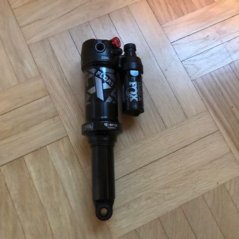 Fox Float X dämpare sitter på. Det är 150mm dämpning bak på ramen.