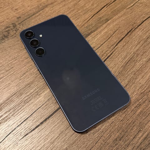 Samsung Galaxy A-series mobiltelefon med 8 /128 GB lagringsutrymme i vit färg. Telefonen har en modern design och levereras med tillhörande laddkabel och originalförpackning.