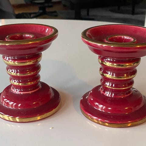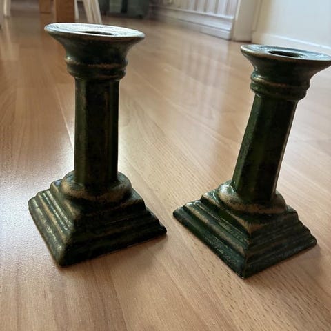 2 små (höjd 5 cm, diameter 3,5 cm, plats för ljus 1 cm) alla med rundade former och en blank yta.