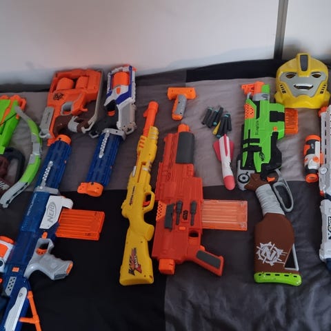 Powermech leksakspistol i blått och vitt. Tillverkad i plastmaterial. Designad för lek och underhållning. Liknar Nerf, automatic, batterier får köpas till.