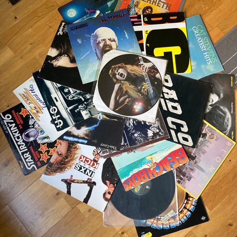 Samling av LP vinylskivor med rockmusik från olika artister inklusive Iron Maiden, Kiss, Ozzy Osbourne, (W.A.S.P. - Såld)och Gary Moore. Skivorna innehåller album från olika år och genrer inom rock och hårdrock.