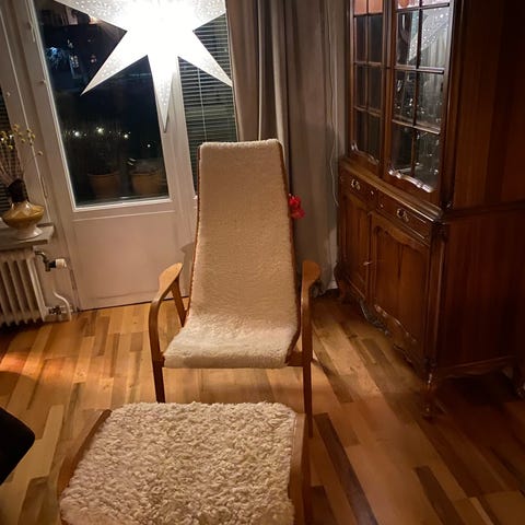 Säljer vår fina Lamino fåtölj med fotpall i ek. Både pall, fåtölj och fårskinn är i fint skick.