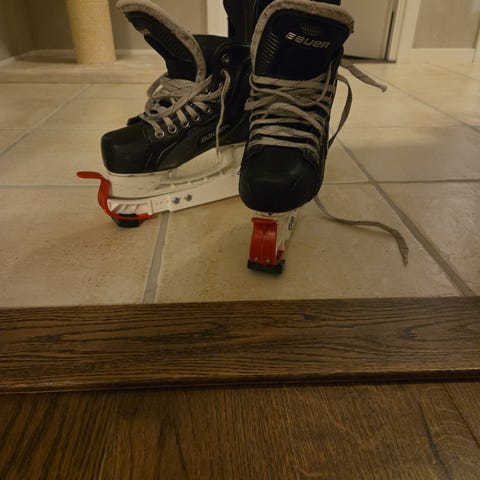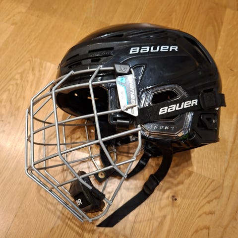 Bauer RE-AKT 150 strl M med galler i strl M. Färg svart. Hjälmskalet är justerbart i storlek m.h.a. klickspännen på sidor och ovanpå hjälmen. Inga skador på funktion/säkerhet, kosmetiska märken från användning på plasten och något ärgade tryckknappar. Nypris 2000-3000kr.