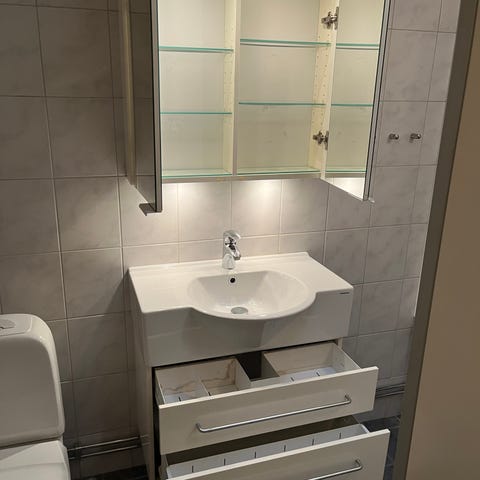Badrumsmöbelset med komod skåp toalett duschdörrar välvda