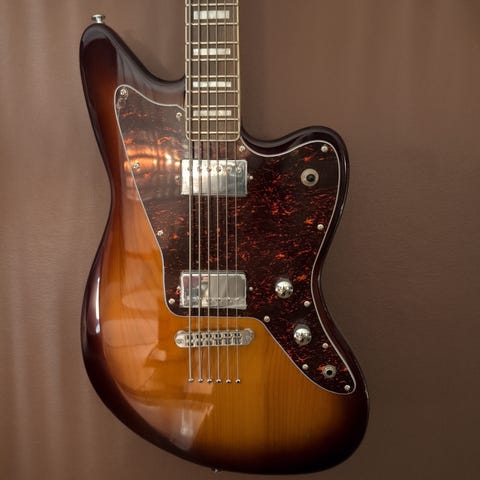 Jazzmaster elgitarr i sunburst-finish. Gitarren har en kropp med två humbucker-pickuper och en hals med blockinlägg på greppbrädan. Passar för olika musikstilar och speltekniker. Stämd en oktav ner.